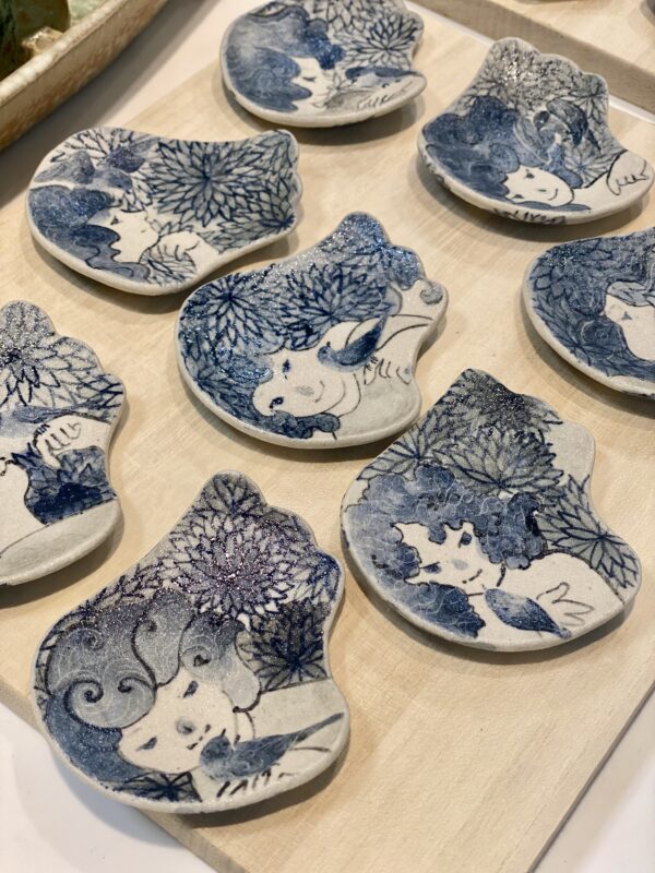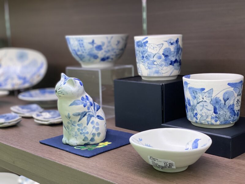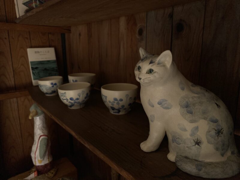絵付けした陶器の器の他、猫の姿に植物や小鳥を絵付けした陶猫。
