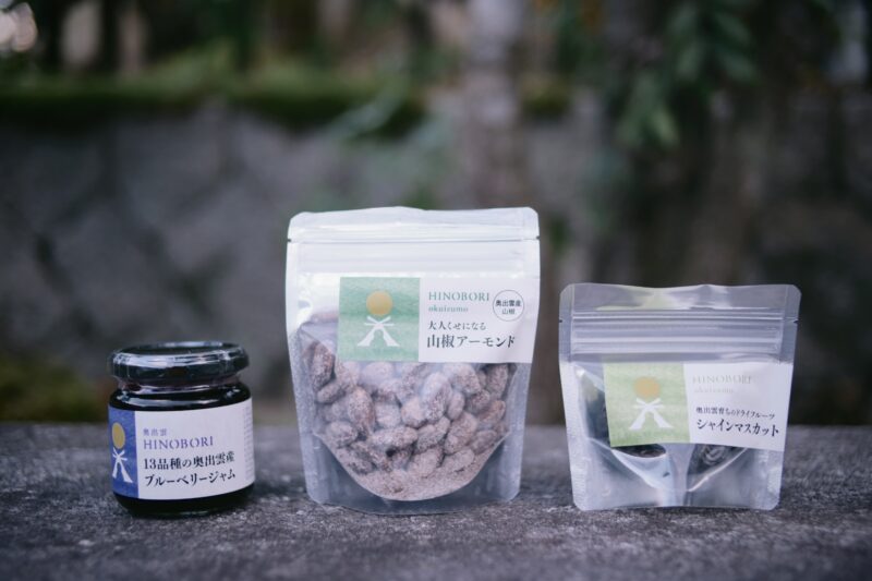 ・山椒やブルーベリーなどの木の実を使った華羅の商品ブランド「HINOBORI」の商品(山椒アーモンドやブルーベリージャム、焼き菓子など)の販売