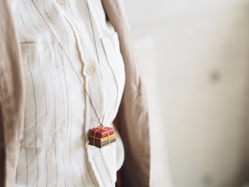 上質な牛革で製作したカバンや本、カメラなどのミニチュアをアクセサリーに仕立てています。