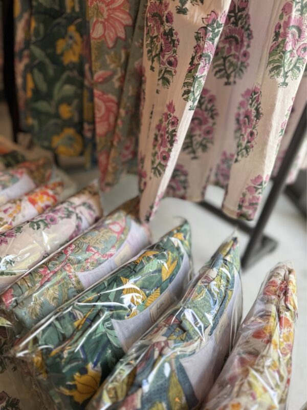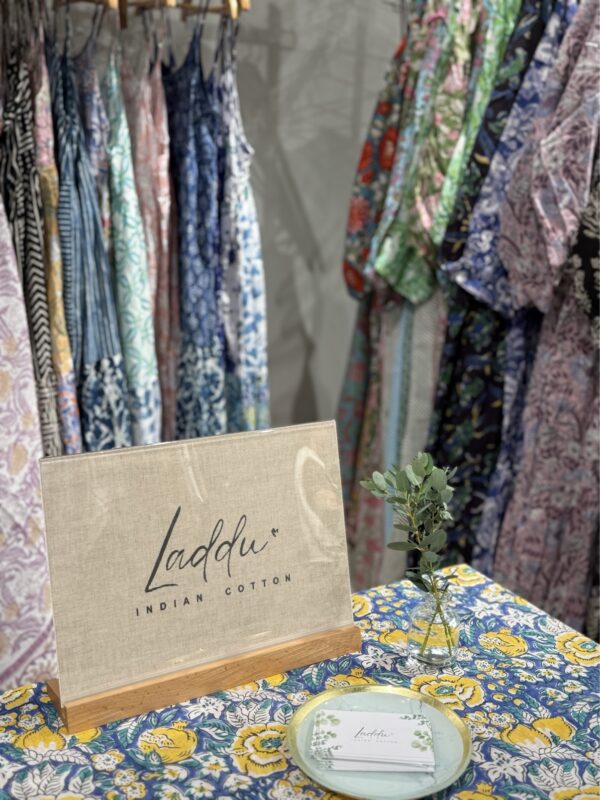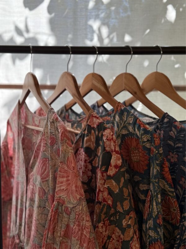 インド綿ブロックプリント生地で作成したワンピースとポーチ、シュシュなどの小物販売。