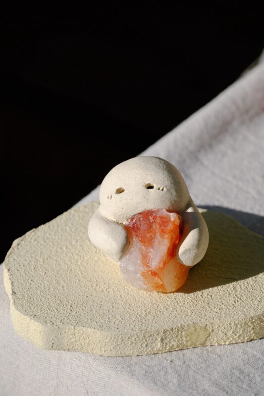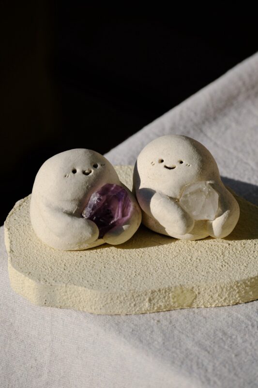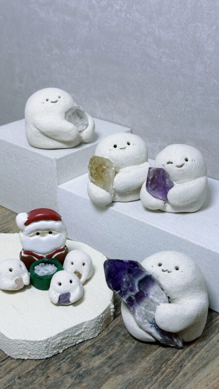 日本製の石粉粘土と台湾産の原木土を独自にブレンドし、天然石(クリスタル)と組み合わせて、可愛らしく温かみのある“小石精霊”や癒しのオブジェを制作しています。