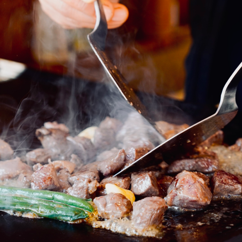 ガス鉄板にてジビエサイコロステーキ(猪、鹿、アナグマなど)ジビエハンバーグ(猪、鹿、アナグマなど)を提供します。