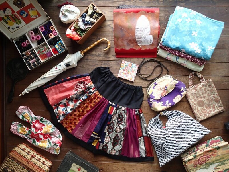 川道商店は、暮らしの中に、着物の新しい楽しみを添える小物をお作りしています。着物リメイクの日傘、帽子、アームカバー、スカート、バッグ、スマホホルダーや、日常生活でもお使いいただける柄足袋の製作も行っています。