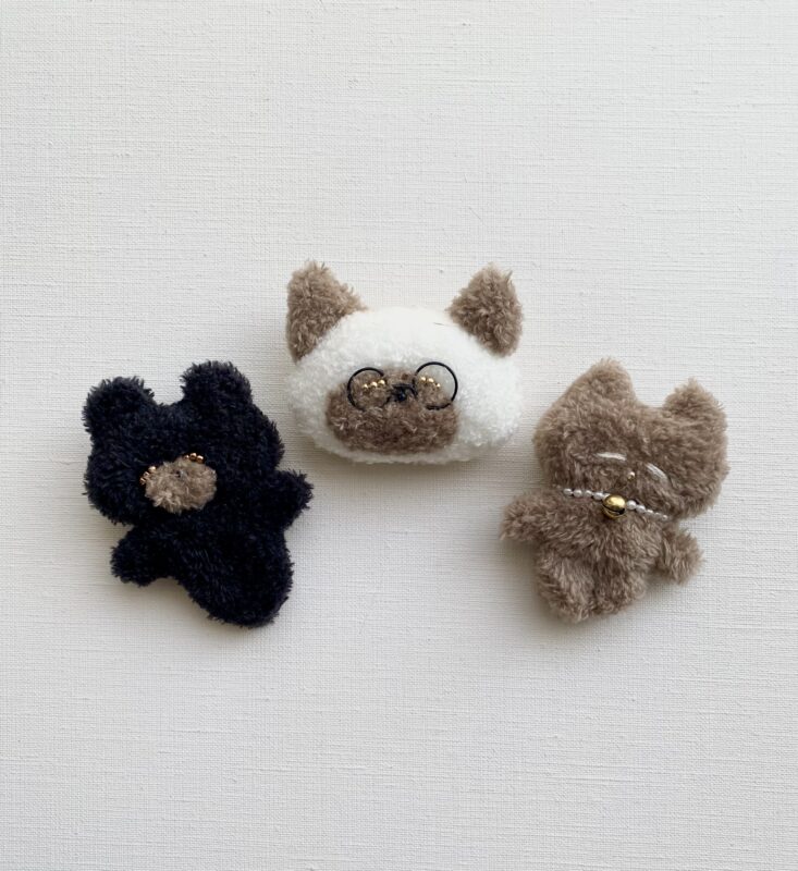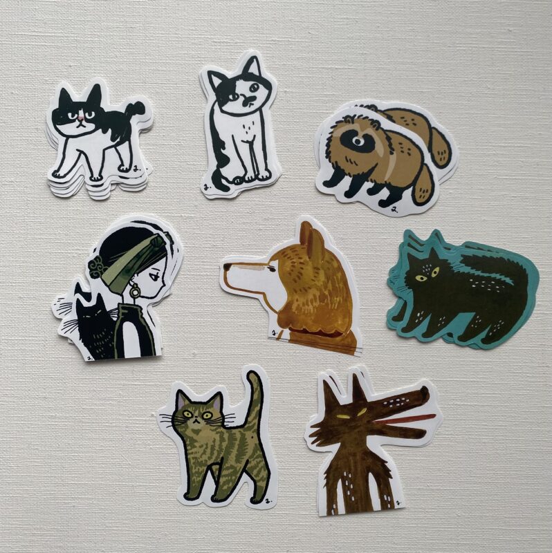 オリジナル動物イラストのグッズ(シール、巾着、エコバッグなど)と、布やビーズで作った動物のブローチです。